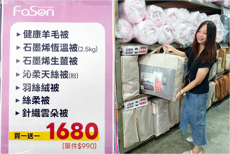▼這一區棉被不管是健康羊毛被、石墨烯恆溫被、天絲被、羽絲絨被等通通買一送一1680元,如果只想買一件的話也沒問題,990元也很超值。