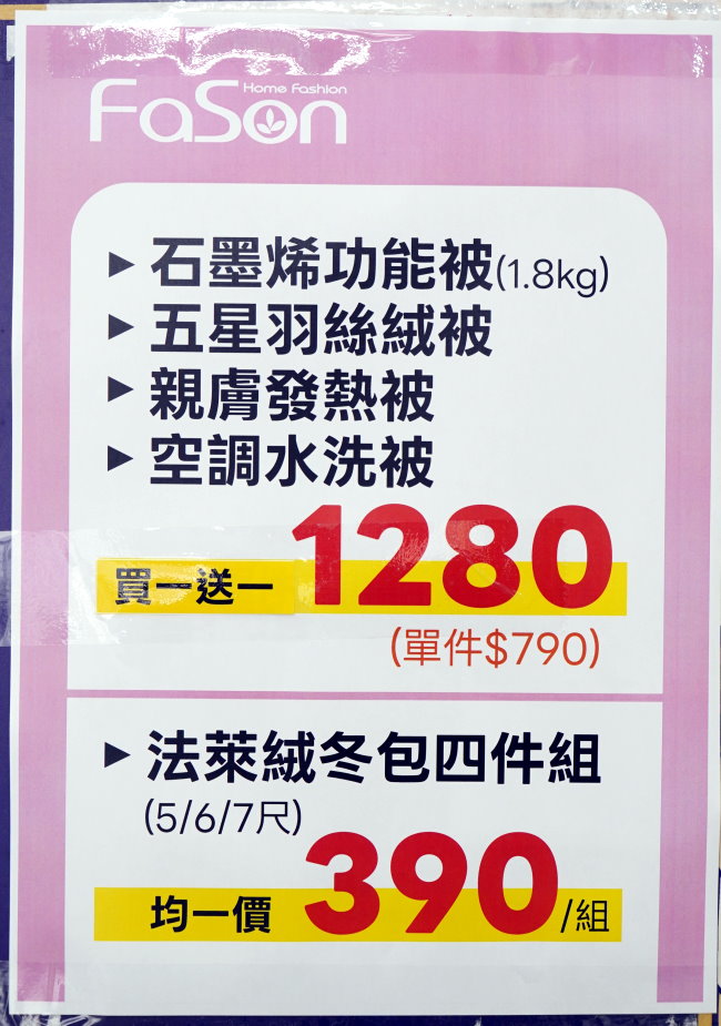 ▼另外還有石墨烯功能被、五星羽絲絨被、親膚發熱被、空調水洗被等,秋冬季節來一件就暖呼呼,通通都是買一送一1280元,單買一件的話則是790元價格也很親民!法萊絨冬包四件組均一價390元,算下來平均一件不用100元,冬天用這個就能有從頭到尾被溫暖包覆的感覺,重點是價格便宜到一個爆炸。