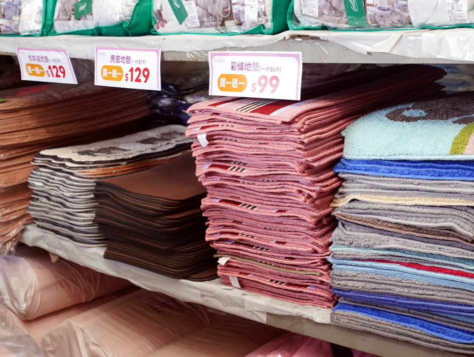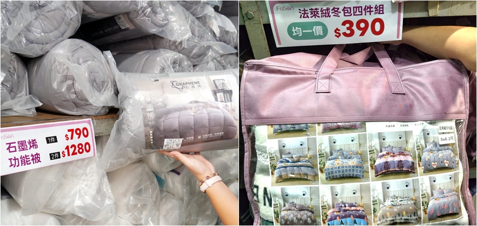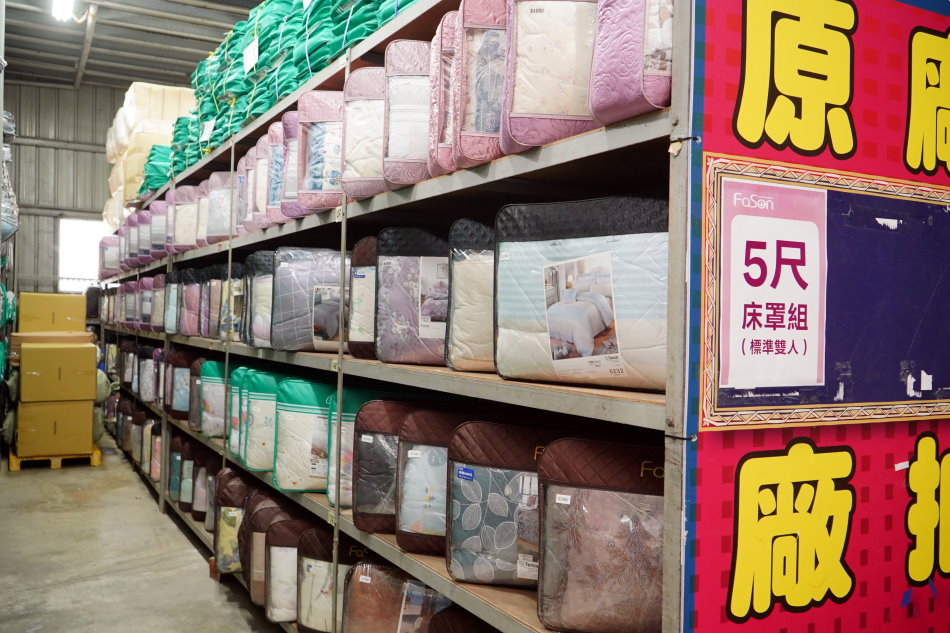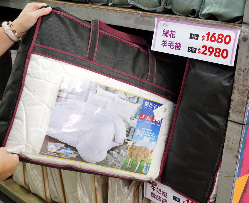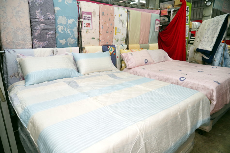 ▼這一整排貨架都是棉被、四件組、床罩組等商品,貨架前方也有詳細的價格標示。