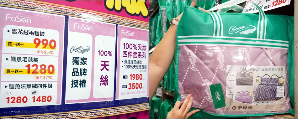 ▼鱷魚牌寢具也是應有盡有,雪花絨毛毯被買一送一990元、鱷魚毛毯被買一送一1280元、法萊絨四件組1280元起(5尺),只要認明綠色包裝都是鱷魚牌的喔!
