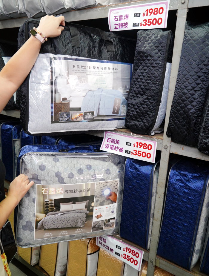▼高科技材質石墨烯也被應用在寢具上,不僅好處多多,而且蓋起來透氣舒適又保暖,現場兩件只要3500元,另外可水洗被也很實用,自己洗才方便,同樣也是2件3500元。