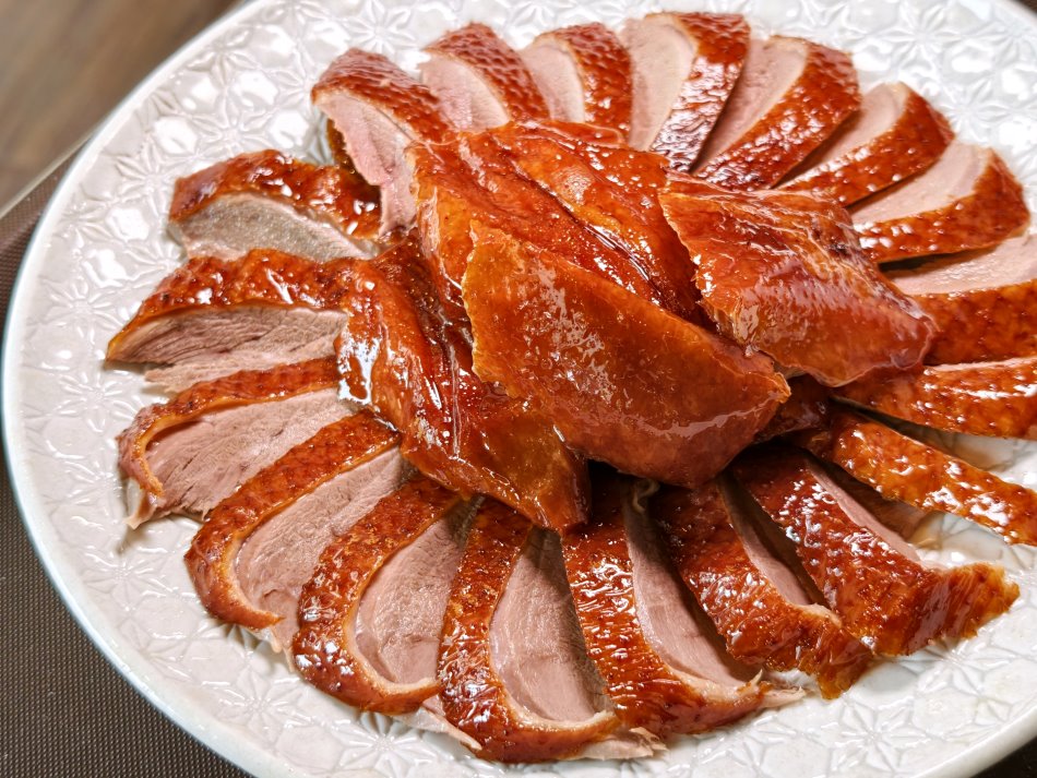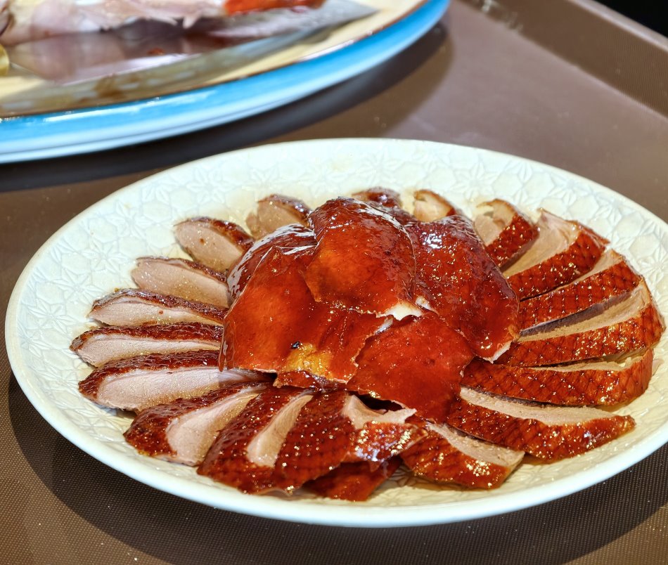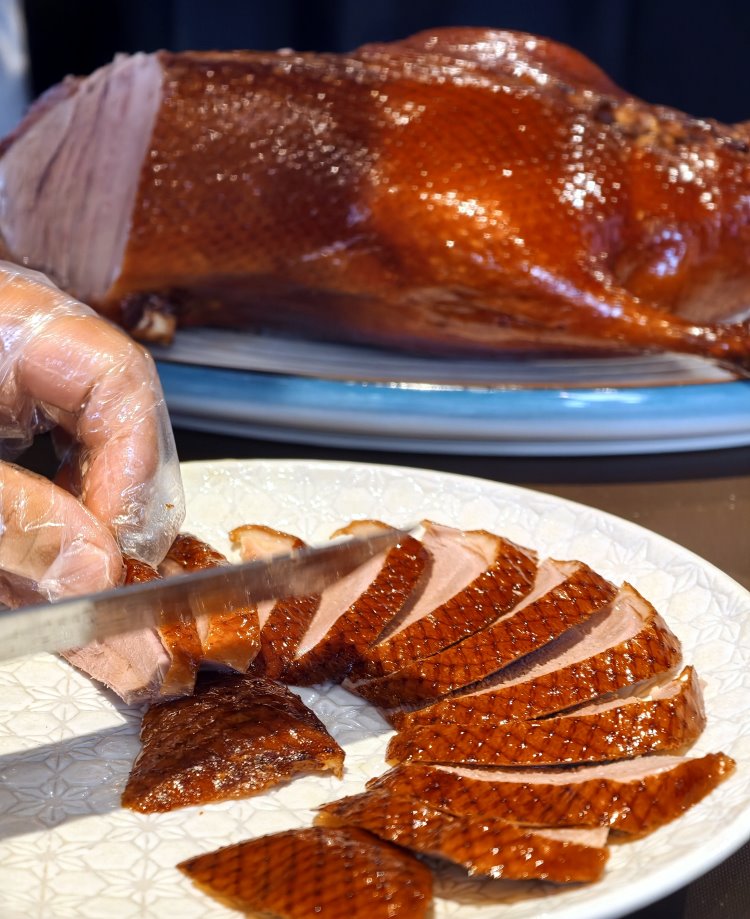 ▼主廚手持俐落片刀,第一刀劃下時,可以聽到鴨皮喀滋一聲,那是外皮極致酥脆的證明;阿肥師動作熟練且沉穩,每一片鴨肉都維持著連皮帶肉的完美比例,片好的皮鴨閃著油光,搭配鮮嫩多汁的粉色鴨肉整齊放在瓷盤上。
