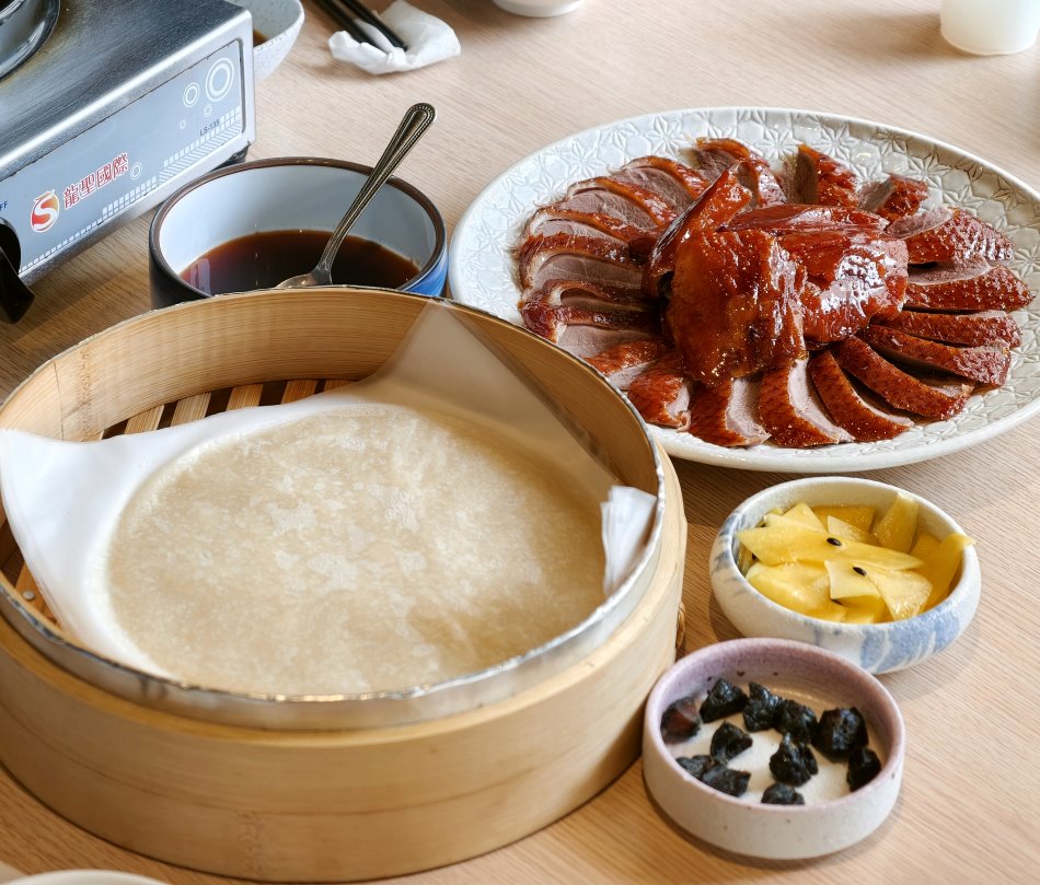 ▼烤鴨經典的吃法就是搭配手工荷葉餅及特製甜麵醬,這裡特別之處在於另外提供了百香果漬青木瓜、蜜餞梅肉,主廚建議我們先搭配這兩款配料試試,喜歡重口味的朋友再加入甜麵醬享用。