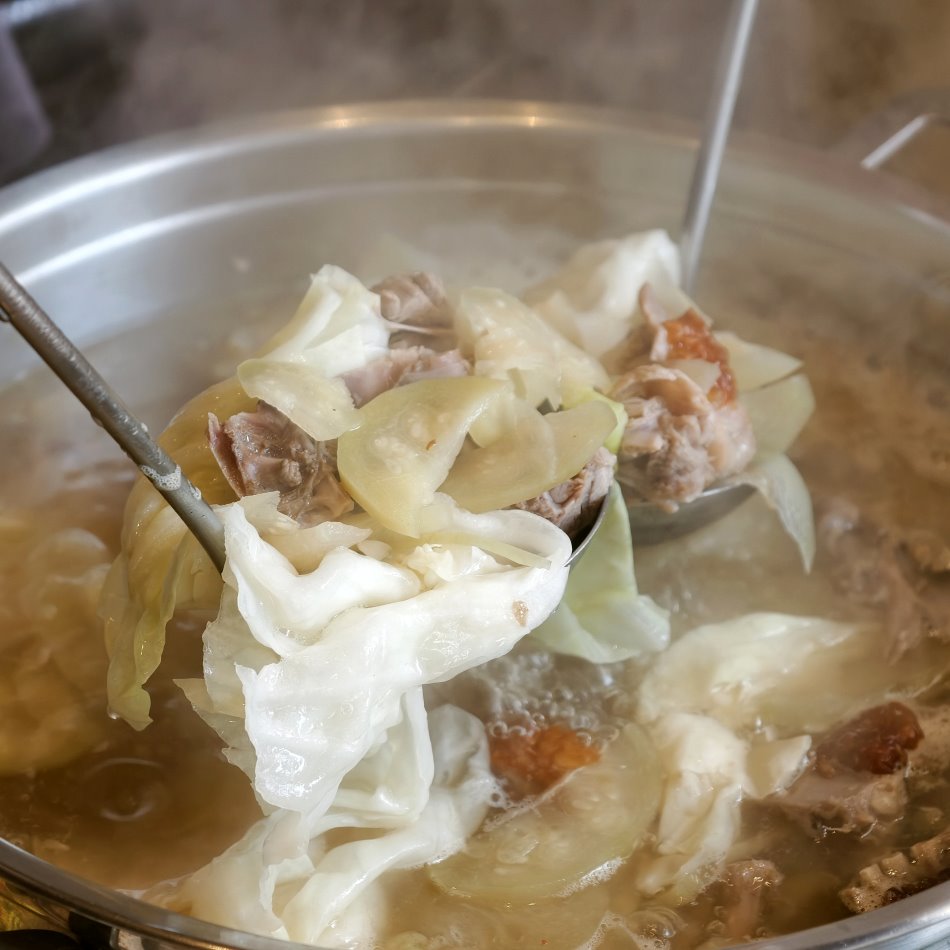▼當鍋子端上桌,湯底呈現清澈的琥珀色,裡面漂浮著切成薄片的西瓜綿(台南傳統醃漬小西瓜)。加熱之後,烤鴨骨架與剩餘皮肉的油脂緩緩滲入湯中,散發出淡淡的果酸香與燻烤鴨油的香氣,吃起來生津又不油膩;烤鴨的香氣與油脂在西瓜綿的加持下,轉化成一種極其醇厚、層次分明的甘甜,清甜的餘韻就算夏天喝也很開胃。