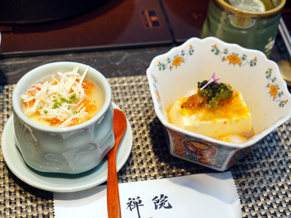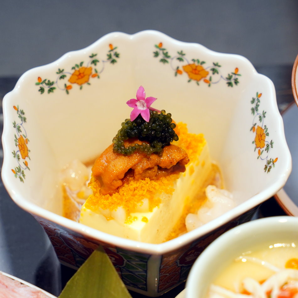 ▼前菜與湯品宛如精緻藝術品,日本海膽烏魚子粉豆腐更是鮮美的極致。質地細膩如脂的豆腐,疊上濃醇甘甜的日本海膽與爽脆海葡萄,最後灑上如金黃粉末般的烏魚子碎,勾勒出海洋的立體層次,鹹甜交織出的深邃鮮味,讓人每一口都嘖嘖稱奇。