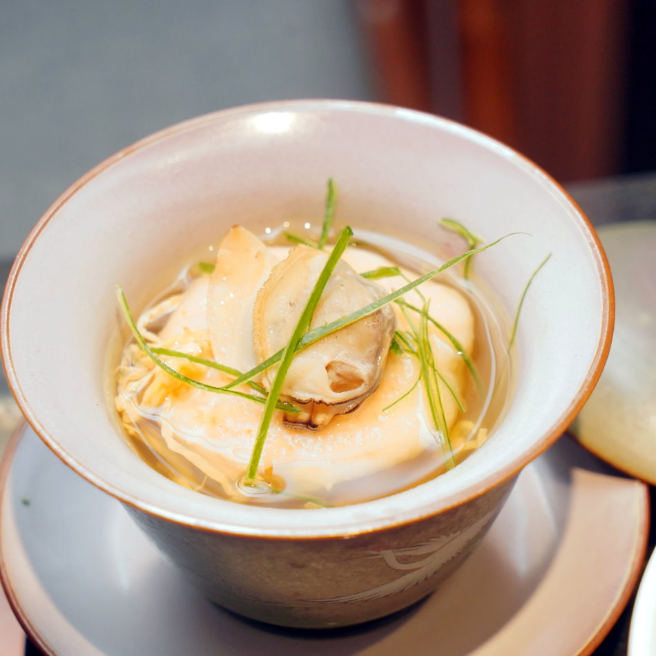 ▼玉露鮮蝦真丈湯裡頭的蝦丸結合了蝦滑與山藥,口感鬆軟帶Q,彈牙的口感散發出鮮蝦清甜。最驚豔的是湯頭融入了玉露綠茶的優雅清香,茶葉的甘甜尾韻精準平衡了蝦肉鮮度,翠綠清徹的湯底入喉回甘悠長,是道極致清爽、毫無負擔的藝術湯品。