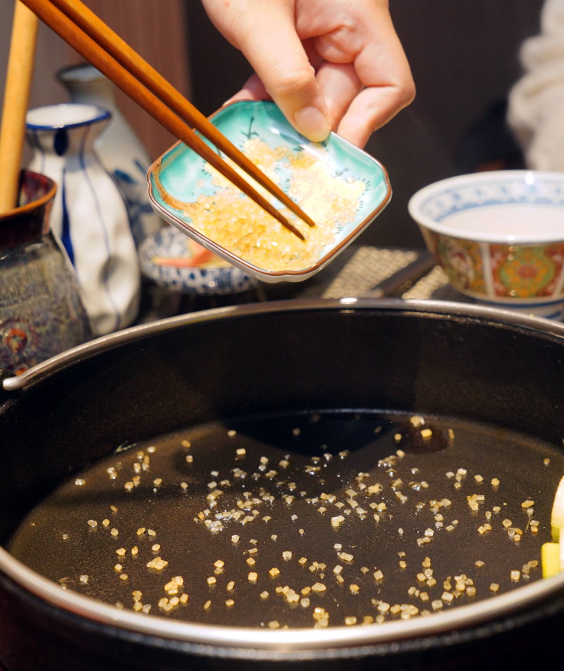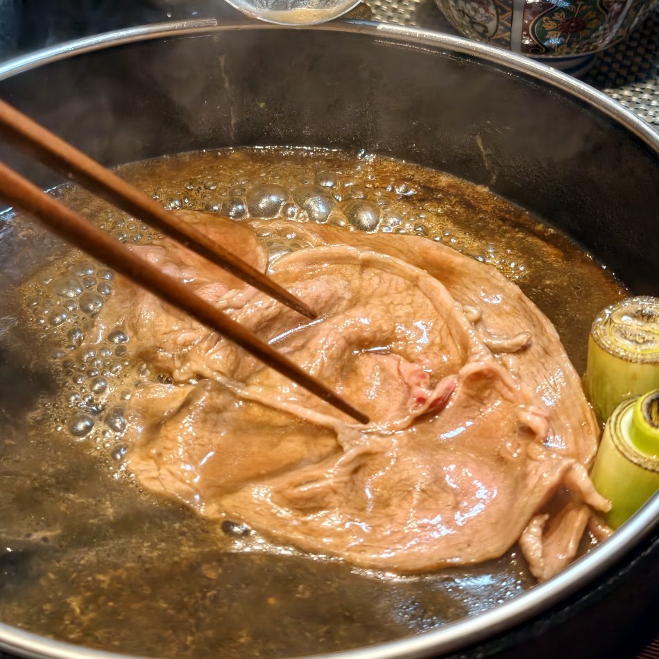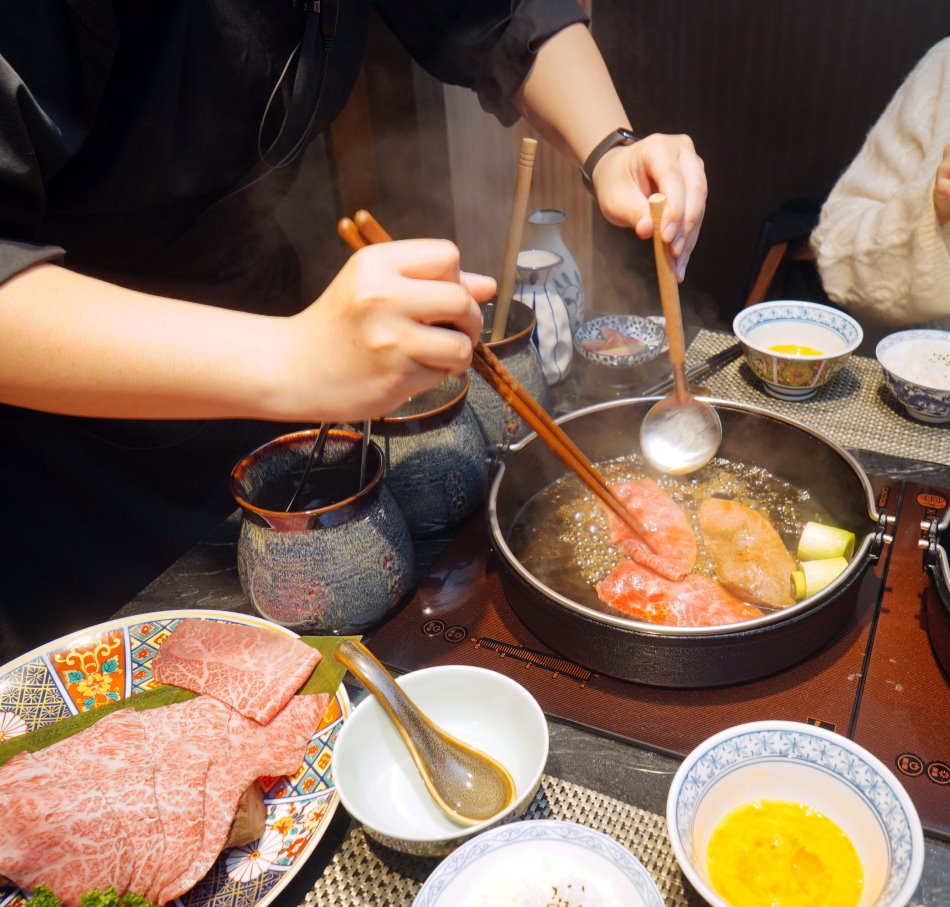 ▼這裡完美承襲京都祇園的百年風味,從醬汁層次、火候到下鍋順序皆極其講究。全程由專人桌邊服務,優雅演繹壽喜燒的極致儀式感,讓大家更能專心聊天、品嘗和牛的精髓;最經典的關西風吃法,是先以牛油刷鍋乾煎大蔥,再灑入溫潤且帶點脆感的日本中雙糖,最後淋上特調醬汁鎖住和牛鮮甜,這滋味簡直堪稱完美。