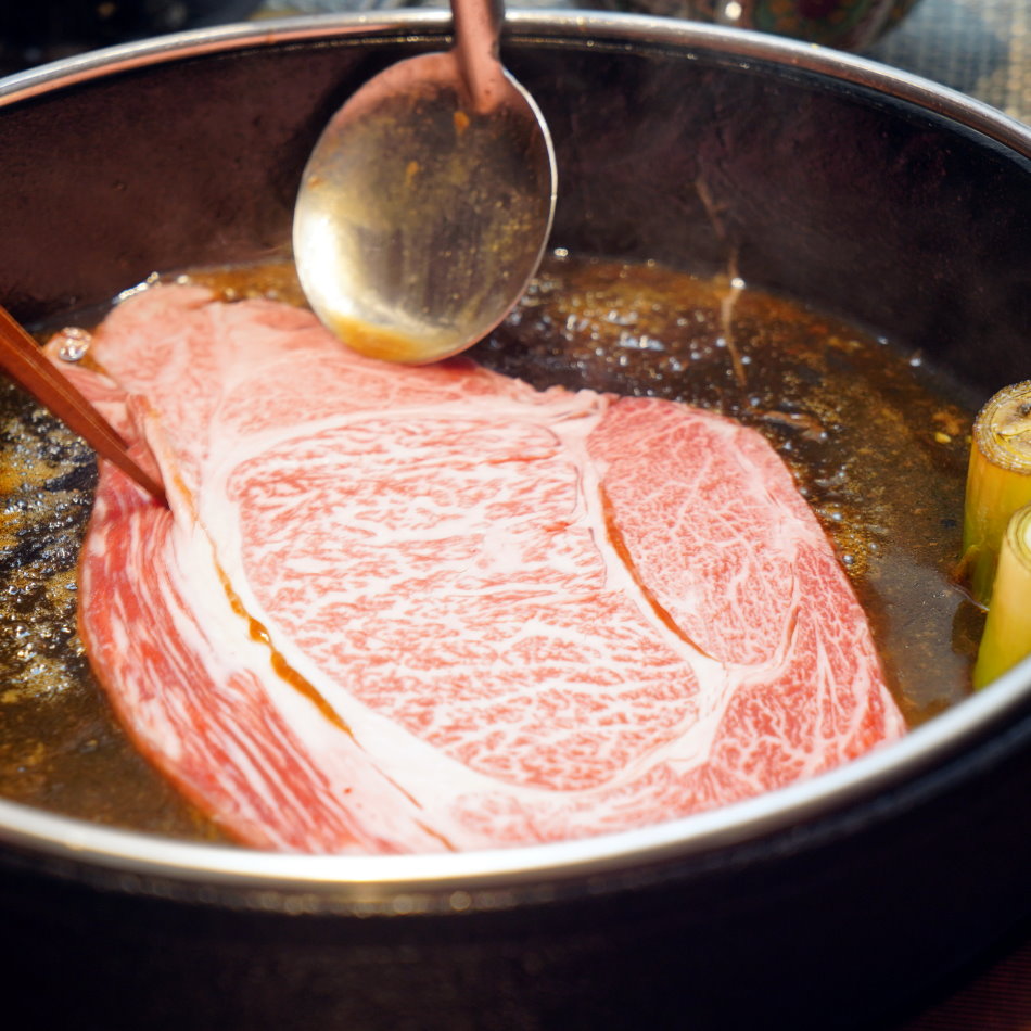 ▼首波登場的是「米澤牛肋眼」,亮點在於那鍋靈魂醬汁——揉合了山利濃口醬油、頂級柴魚、昆布與日本中雙糖,交織出地道的關西風韻。看著肉片在鍋中輕快飛舞、吸附精華,轉瞬間華麗起鍋,那股撲鼻而來的醬香與脂香簡直太誘人!