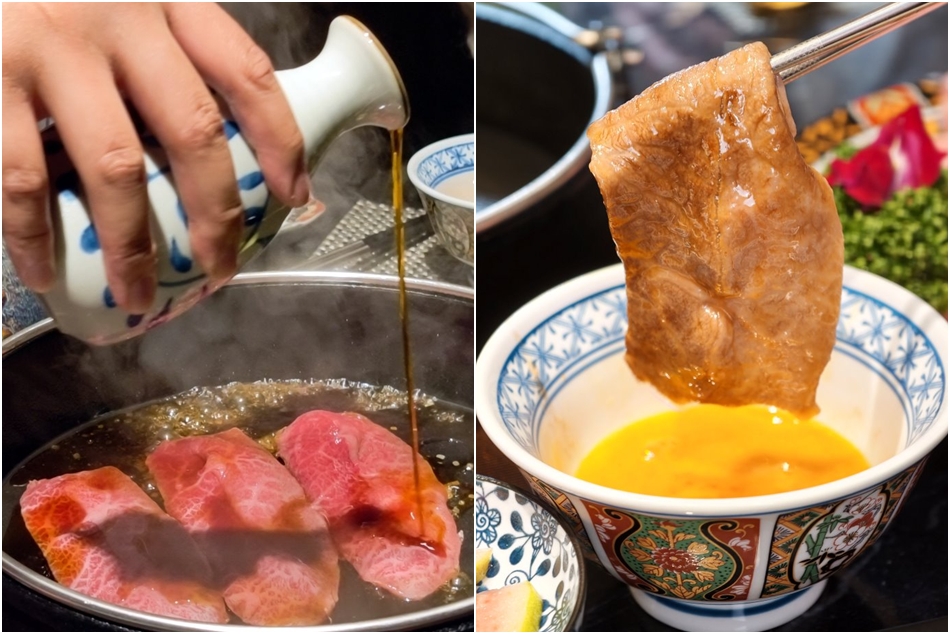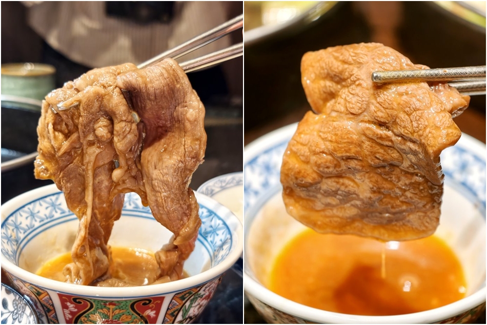 ▼壽喜燒的靈魂吃法!左圖為「和牛肋眼」,豐腴油脂在鍋中飛舞後,浸入生食級蛋液,入喉瞬間化作濃郁奶油香,完美體現入口即化的夢幻口感。右圖則是「和牛翼板」,肉質纖維極為細緻且筋少,沾裹蛋液後口感滑順平衡,柔軟中仍保有討喜的彈性,吸附醬汁後,每一口都是油脂與鮮肉的華麗交織。