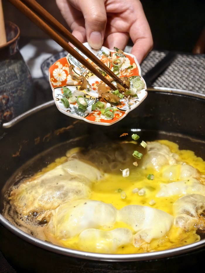 ▼席間吃完豐富的時蔬配料已近九分飽,正當以為劃下句點時,壓軸的療癒饗宴才正要登場。服務人員悉心地利用鑄鐵鍋底殘留的壽喜燒精華,慢火推演一場「京都祇園松露滑蛋蓋飯」的美味烹調秀。看著蛋液在鍋中與醬香交融、轉化為細膩滑蛋的過程,不僅視覺上極度療癒,更是對這場饗宴最完美的禮讚。