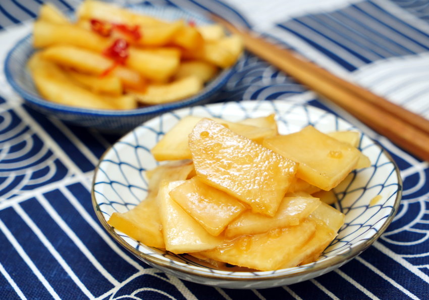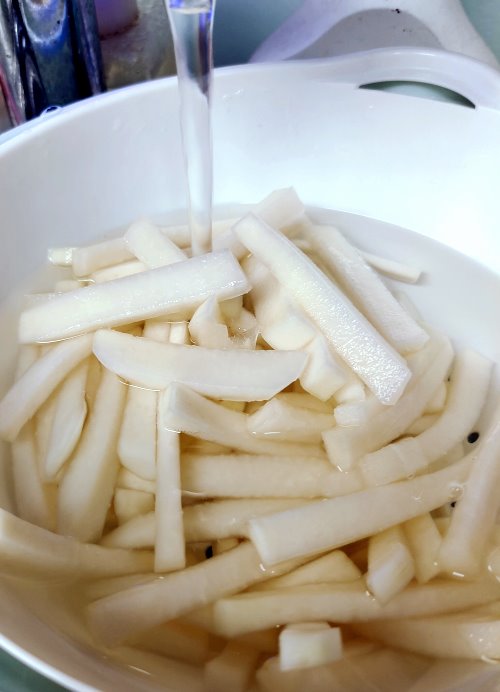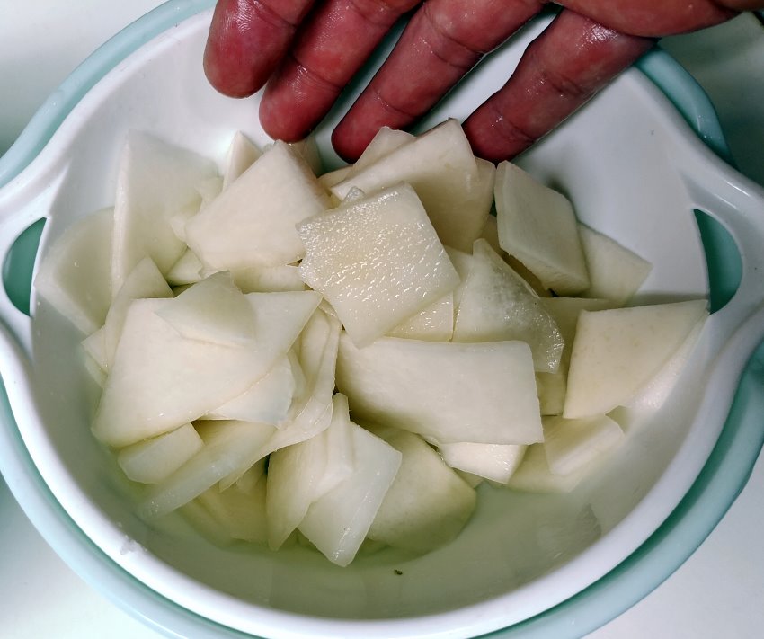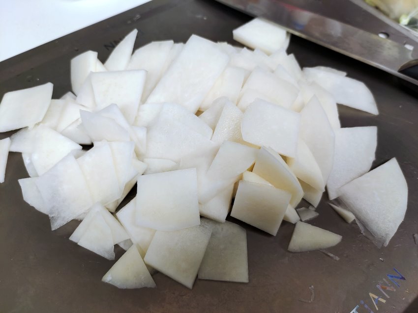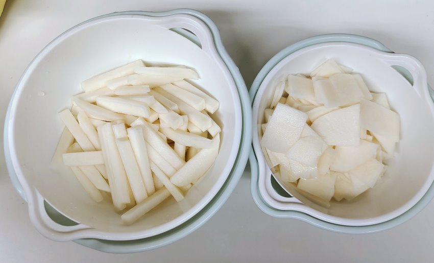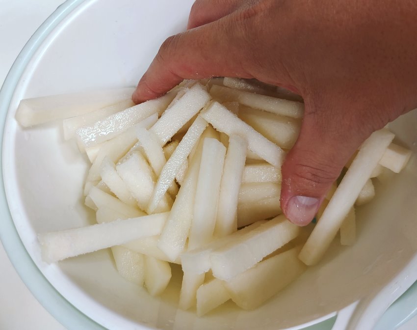 1.將大頭菜外皮切除,白色部分都要切乾淨,再切成自己喜歡的形狀,如薯條狀、薄片狀。