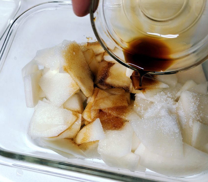 3.洗淨的大頭菜加入蒜頭、醬油、香油、砂糖、辣椒、辣粉混合均勻。