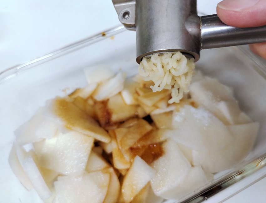 ▼直接用壓蒜器就是這麼快速又療癒~ 半顆大頭菜我用大約3顆蒜頭~