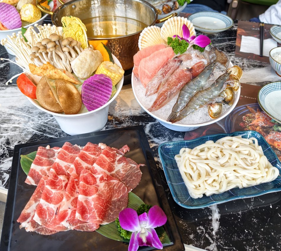▼我們享用的是最新推出的活鮑魚海鮮火鍋,每人699元(加10%服務費)就能享昆布湯底(川味麻辣湯底需額外加價)、主食(白飯或烏龍麵任選一種)、菜盤、肉品(黑豬梅花或美國牛肉任選一種)及活鮑魚海鮮拼盤,而且門票可以全額折抵,吃起來很划算。