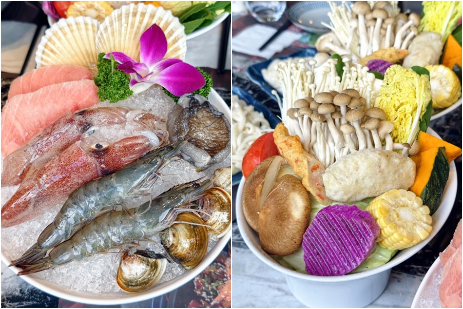 ▼活鮑魚海鮮拼盤裡頭有萬里小卷、鮮蝦、蛤蜊、鮪魚腹肉及活鮑魚,不用跑海港就有新鮮澎湃的海鮮可以享用;菜盤則是有多種蔬菜、菇類,特別的是還有甜不辣跟豆腐阿給,吃過的都說讚。