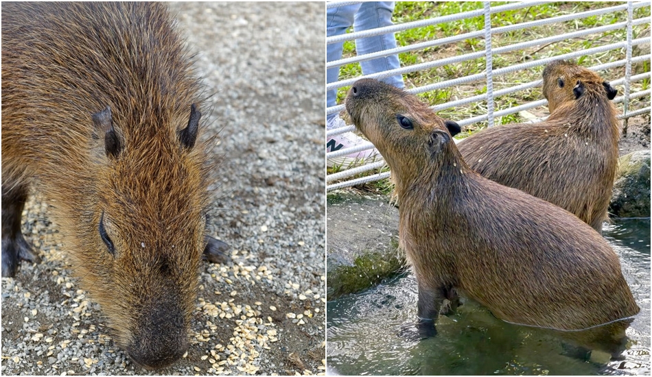 ▼水豚君年紀還很小,看起來呆萌又討喜,有時候為了吃東西還會不小心把柯爾鴨給推走,真的很促咪。