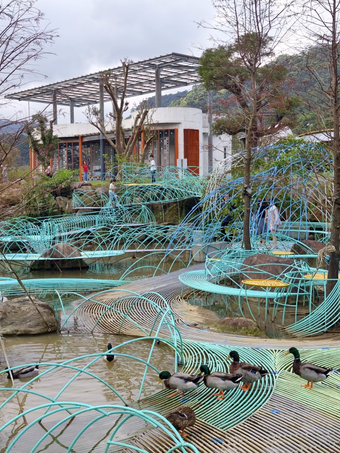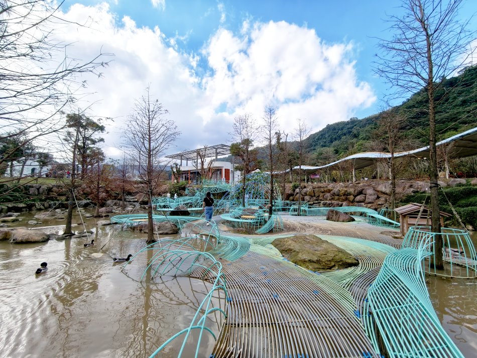 ▼這一區也是由劉丁讚老師及團隊採用數十噸鋼筋所建構的景觀水上步道,利用水藍色、薄荷綠勾勒出亮眼的色彩,同樣依地形而建,強調與自然共生;池中的落羽松在秋冬季節會轉換成夢幻的紅棕色,映照在池畔更加夢幻。