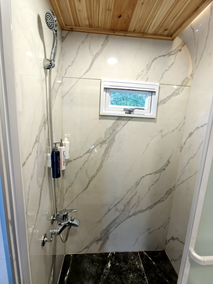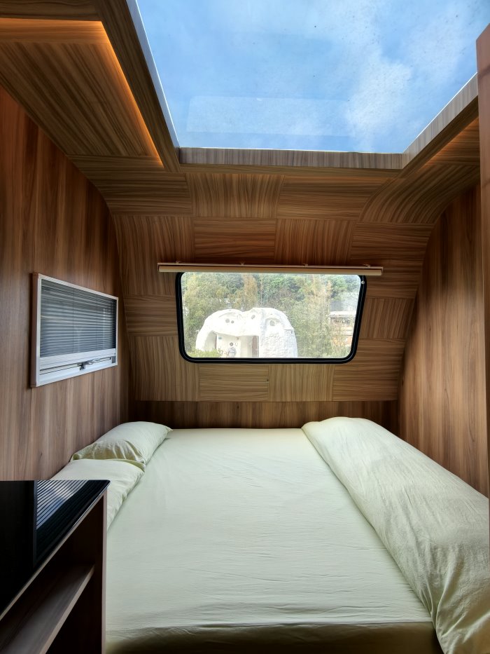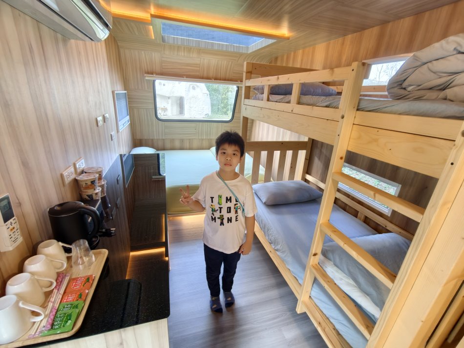 ▼露營車可說是麻雀雖小五臟俱全,有一張雙人床及上下舖,是小朋友最喜歡的組合;裡頭還有冷暖空調、熱水壺、沖泡飲品、泡麵等,住在裡頭也太幸福了!