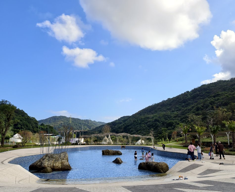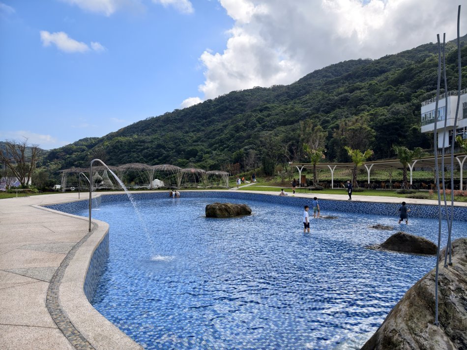 ▼小朋友看到戲水池二話不說馬上就衝下去踩水,這裡被綠意山景給包圍,可說是最美戲水池無誤,大人也可以在旁邊的吧台區喝飲料休息。