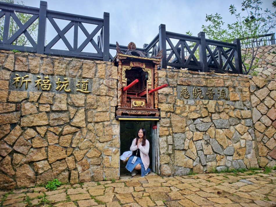 ▼祈福坑道旁就能清楚看見馬祖著名的地標「媽祖巨神像」,落成於2009年10月的媽祖巨神像,高度為28.8公尺,加上避雷針為29.6公尺,與媽祖實際面積相符;媽祖巨神像是由365塊花崗石所雕琢而成,象徵一天365天日日平安,現場看起來既壯觀又慈悲,旁邊還有小尊的媽祖神像,據說是當初媽祖巨神像的樣本,在這裡就能拍好拍滿啦!