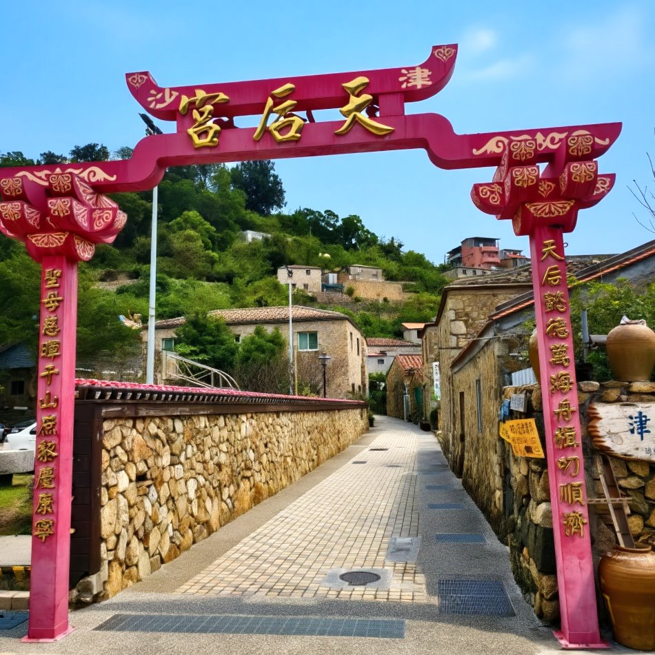 ▼津沙境天后宮是南竿三大天后宮之一,為傳統閩南式三門三開間之建築,天后宮最早建於清道光年間,歷史悠久,經多次重建才有如今樣貌,是津沙村居民的信仰中心,供奉的也是馬祖唯一的黑面媽祖,據傳早期津沙天后宮媽祖也是粉面媽祖,在廟宇重建時,雕塑師傅受到媽祖託夢顯像為黑面媽祖,後來經村內長老請示後塑造黑面媽祖,也是少數不是位於澳口的媽祖廟。