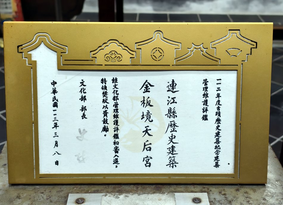 ▼擁有超過百年歷史的金板境天后宮據傳為清嘉慶年間大海盜蔡牽為求神明庇佑所建,歷經四次整修,採用傳統閩東式封火山牆的建築方式,以避免火災後延燒至其他房子,也是馬祖地區保留最多原始樣貌的媽祖廟,因位處馬祖鐵板村,故有「鐵板天后宮」之稱。