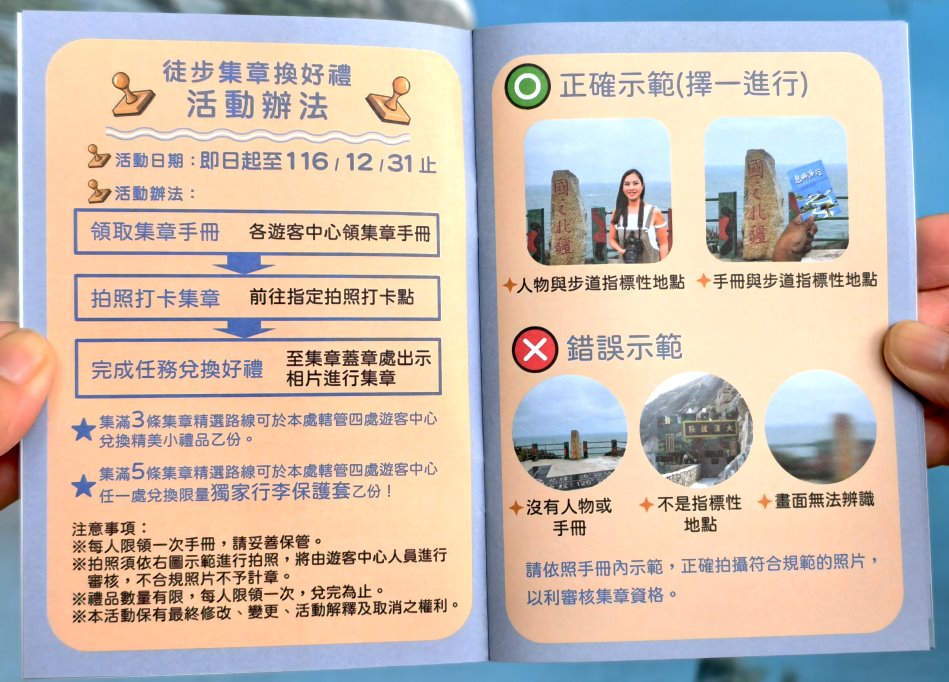 ▼徒步集章換好禮的方法也很簡單,先到遊客中心領取集章護照後,前往指定拍照打卡點拍照,完成任務後即可到蓋章處出示照片進行集章,集滿3點或5點就有不同的好禮可以免費兌換。(活動內容以現場公告為主)