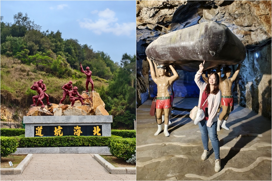 ▼北海坑道位於鐵板海岸線,是一個「井」字型的交錯水道,全長約700公尺,須配合潮汐的漲退,在退潮時才能進入,全程走完約需30分鐘;這裡是可以提供登陸小艇使用的地下坑道,以當年的技術來說可是非常高難度的工程,堅硬的花崗岩除了用炸藥爆破之外,全靠人力挖鑿而成,真的是非常艱辛,可說是鬼斧神工之作。
