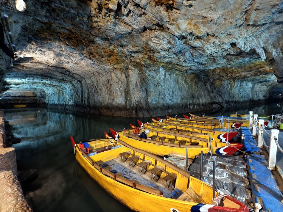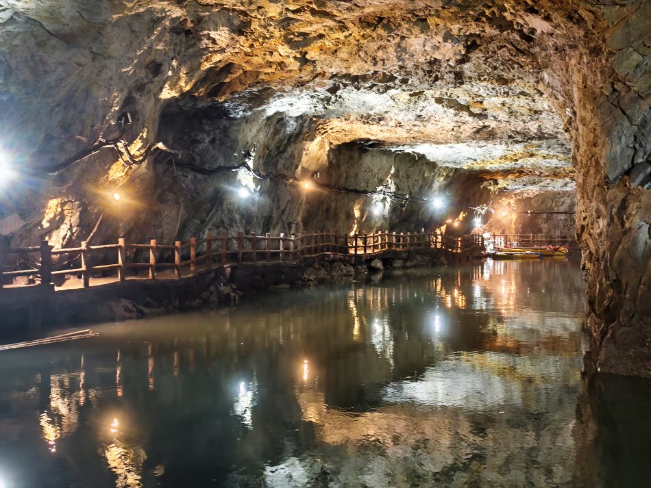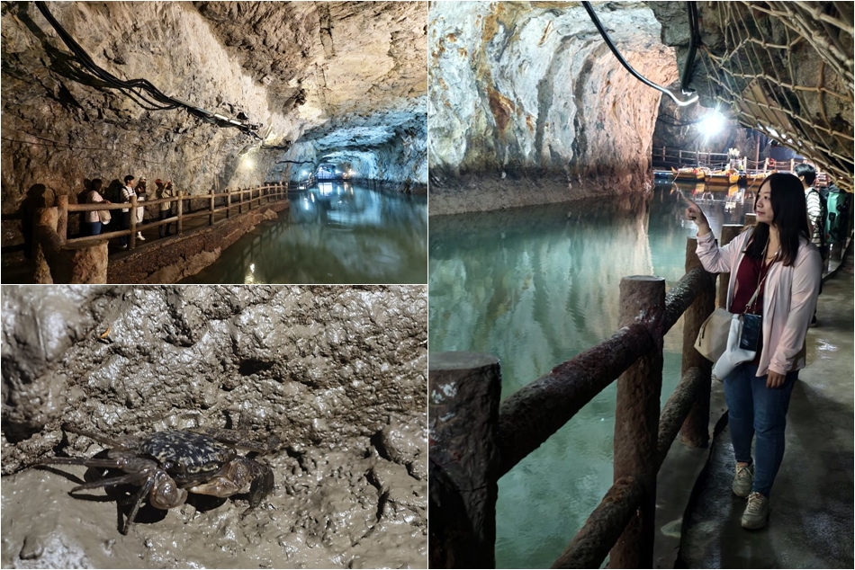 ▼當天運氣不錯,剛好是退潮時間而且遊客不多,我們幾乎是包場的狀況~~壯闊的岩壁搭配燈光反射的倒影,讓人不由得讚嘆起來,而且裡頭冬暖夏涼,也是不錯的避暑、避寒勝地。另外這裡也是觀賞藍眼淚的熱點之一,因為坑道內幾乎沒有光害,當夜幕漸漸低垂,就能搭乘搖櫓船去尋覓那迷人的藍色光影,據說是欣賞藍眼淚的保證班喔!