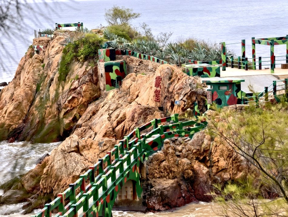 ▼鐵堡式位於仁愛村鐵板海邊的獨立岩礁,經由長長的棧道才能抵達,因地形險要、便於觀測海面動靜,早期曾是軍事據點,因防禦需求,將岩礁內部鑿空,上頭附以水泥掩蓋,再塗上迷彩漆料,內部則是挖空的坑道,這裡有士兵的房間、廁所及生活空間,還有砲台、射口等,甚至還有軍犬的住所,穿梭其中更能感受到當年海上堡壘的氛圍。