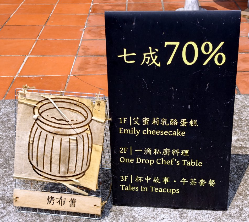 ▼七成代表不過度、不矯作,是一種恰到好處的簡單,一樓為外帶區,二、三樓為品茶內用區,開店的同時門口也會張貼今日限定商品讓遊人參考。