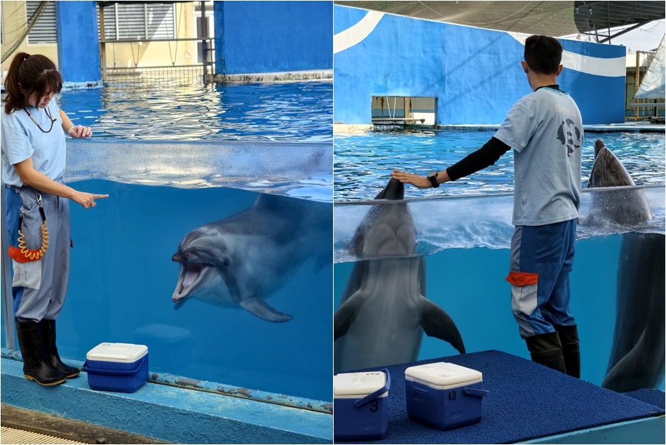 ▼隨著照護員的手勢與口令,海豚也乖巧的讓我們看看牠的身體構造,原來海豚音是高頻率,所以聽不見人類低頻的聲音,只能憑照護員的手勢或動作來辨識。