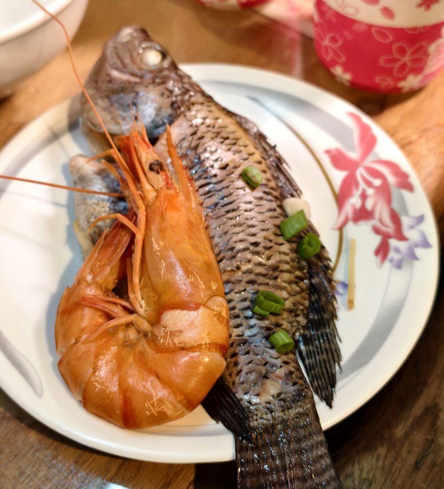 ▼鮮蝦,個頭還不小,紮實Q彈又鮮美,單吃就很美味,搭配蒜頭醬油更有古早味的感覺。