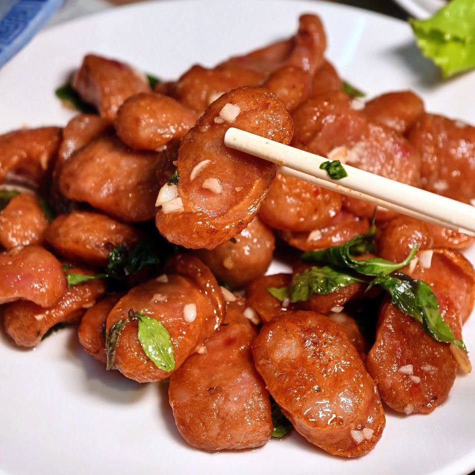 ▼虱目魚香腸,這道更是推薦必點,虱目魚香腸搭配蒜香與九層塔香非常開胃,鹹甜軟Q又夠味,我們忍不住一口接一口。