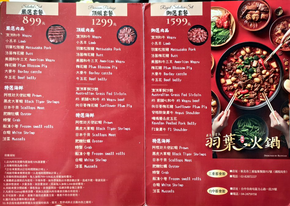 ▼羽葉麻辣火鍋還有提供套餐,而且份量十足,想吃好一點的朋友點套餐就對了~~有嚴選套餐899元、頂級套餐1299元、御選套餐1599元等三種價位,肉品、海鮮會通通上一份(非無限續點),人多或是想吃高級一點的食材可以考慮點套餐。