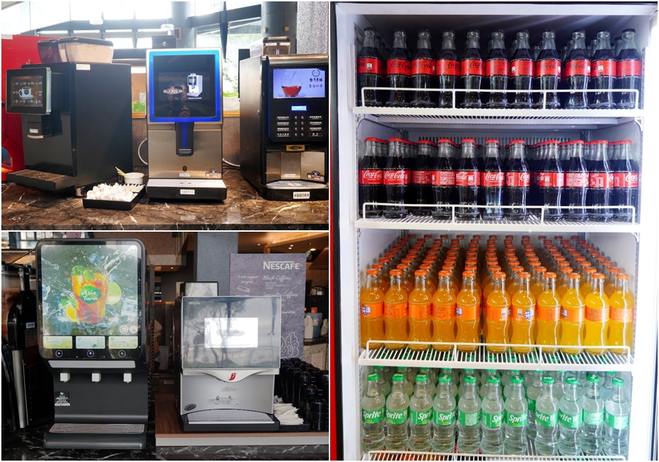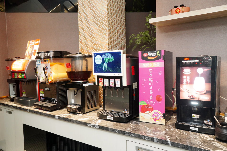 ▼飲料區還有不少選擇,像是果醋、冬瓜茶、美粒果冰沙、氣泡飲料、蘋果汁、咖啡機等,不管冷熱飲通通有,最棒的是還有曲線瓶,還有我們最愛的芬達好開心。