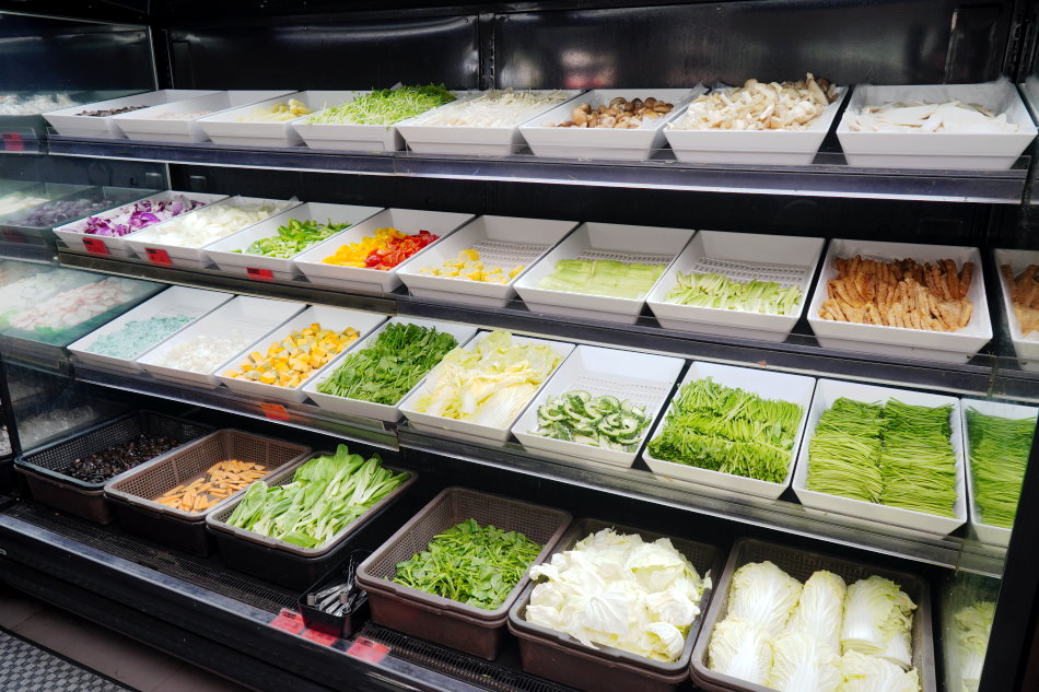 ▼除了套餐的肉品、海鮮之外,其他火鍋食材通通都在這一區自己拿,有蔬菜、菇類、火鍋料、海鮮等等,還有麵食、冬粉、意麵、蒸煮麵等主食及炸豆皮、豬澎皮等多元食材,光是這一面食材牆就能吃到飽翻天啦!