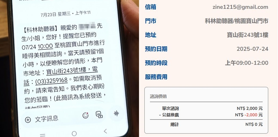 ▼預約完成後會收到預約完成的簡訊,並安排專人電話確認預約時間;預約日期前一天也會收到提醒簡訊,算是相當貼心~~而且科林睡得美的睡眠評估是完全免費,只要預留一個小時左右時間,好好了解狀況即可。