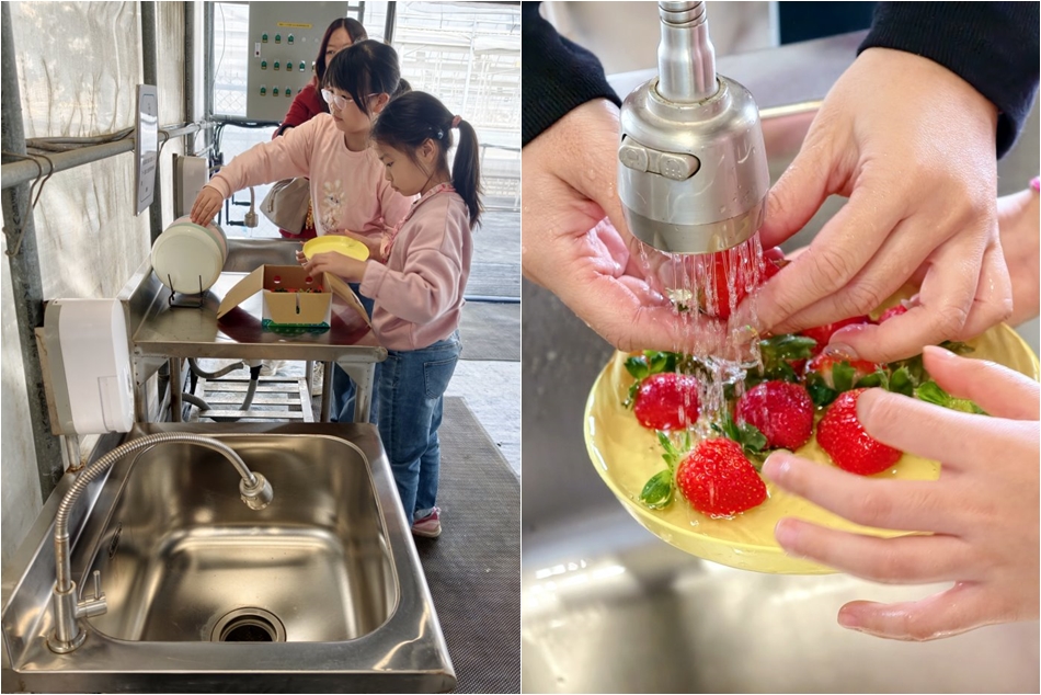 ▼一旁設有洗手台及餐盤,有機草莓因為沒有施打農藥,簡單沖洗後就能安心享用。