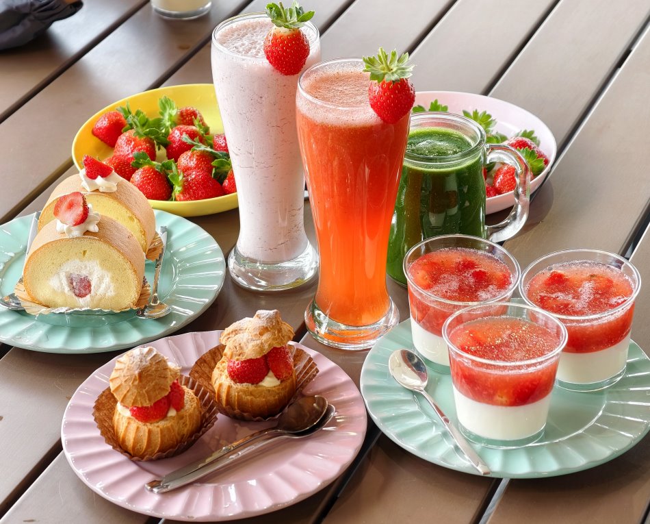 ▼看到草莓甜點、飲品就受不了,我們也點了一些來品嘗;這裡有提供綠拿鐵、草莓汁、草莓牛奶、草莓泡芙、草莓生乳捲、草莓奶酪,搭配我們自行採的草莓根本是一頓豐盛的草莓大餐;綠拿鐵採用自行耕種的羽衣甘藍製成,喝起來完全無草腥味清香順口~草莓汁、草莓牛奶帶有微微的草莓酸甜,喝得出天然的果香!草莓泡芙、生乳捲、奶酪都很有水準,媲美咖啡店的美味,喜歡草莓的朋友可以吃一波。