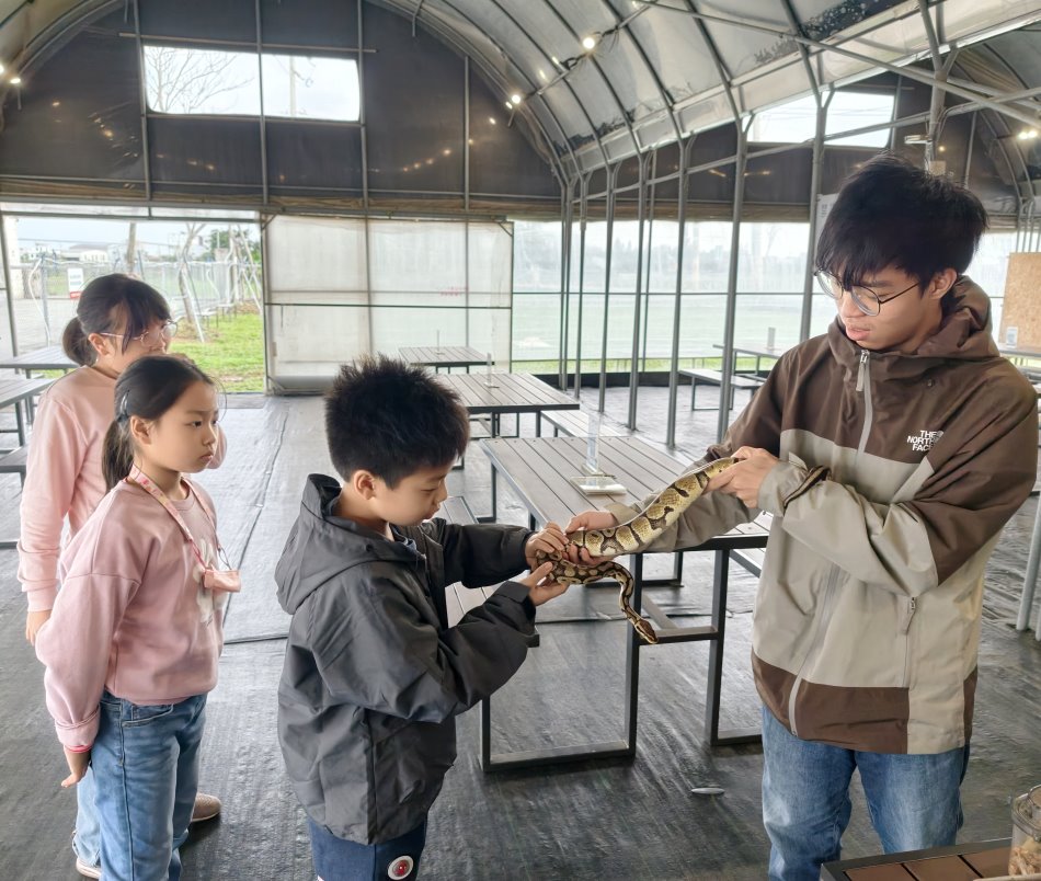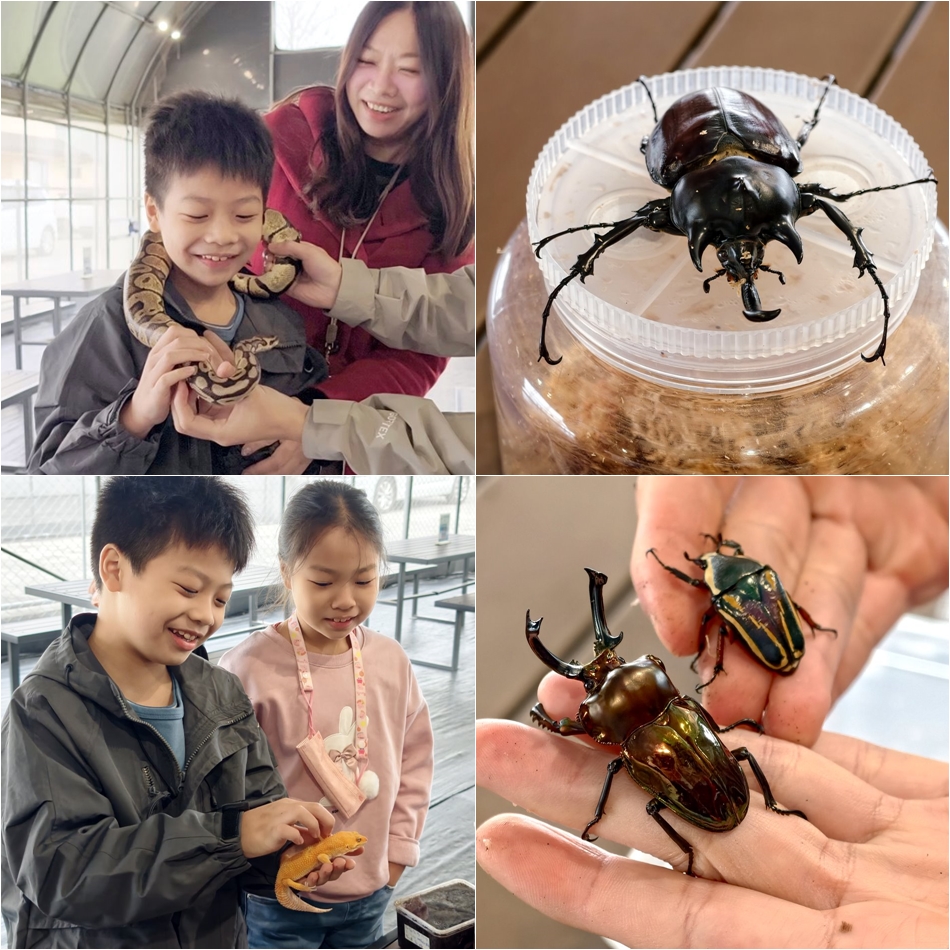 ▼沒想到小口弟天不怕地不怕,第一次摸到球蟒很開心,拿來當圍巾也不害怕,真的是厲害!此外還有鍬形蟲、守宮等多種昆蟲、爬蟲類,不僅可以學到知識還可以觸摸體驗,喜歡爬蟲類的小朋友一定超愛。