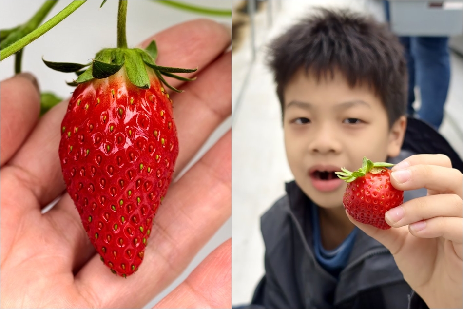 ▼這裡還有種植少量紅顏草莓與稀有雪兔白草莓,雪兔白草莓以細緻奶香與清爽微酸著稱,是大人也會愛上的高級風味;其中紅顏草莓真的很特別,外型呈現亮麗鮮紅的長錐形,特色在於帶有濃郁的香檳葡萄香氣,用聞的有種類似葡萄水果糖的味道,所以被小朋友形容成很像葡萄嗨啾軟糖的味道,吃起來細緻多汁、紮實甜美,層次相當分明,吃一口就愛上!不過因為紅顏草莓種植不易,產量稀少,所以也被視為是極珍貴的逸品,有興趣的朋友可以直接跟店家洽詢。