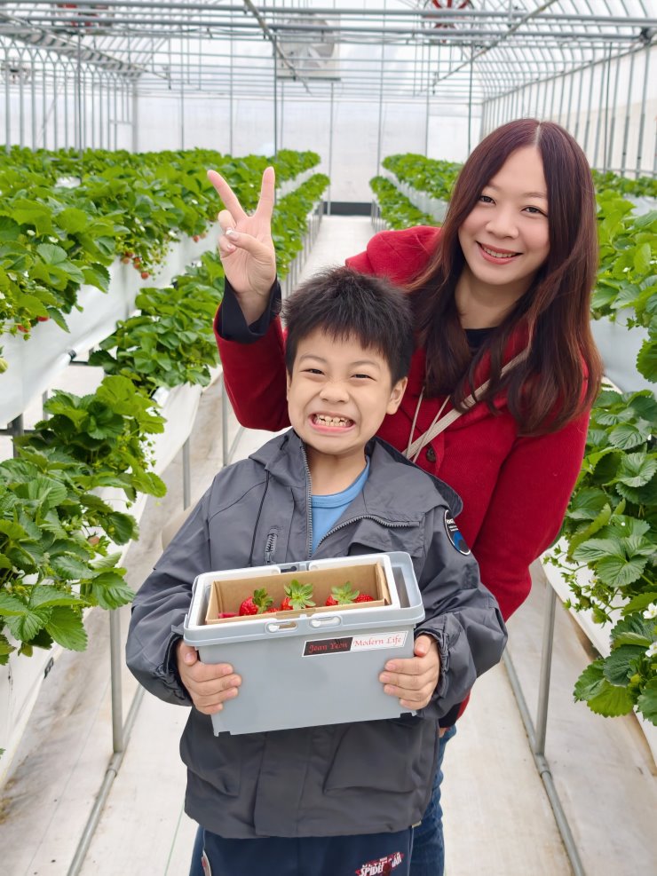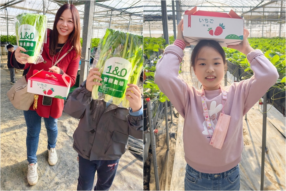 ▼我們採了兩大盒草莓準備回家享用,成果豐碩,小朋友都很期待草莓的美味;這裡採一盒草莓還會加送有機蔬菜,真的是太佛心啦!