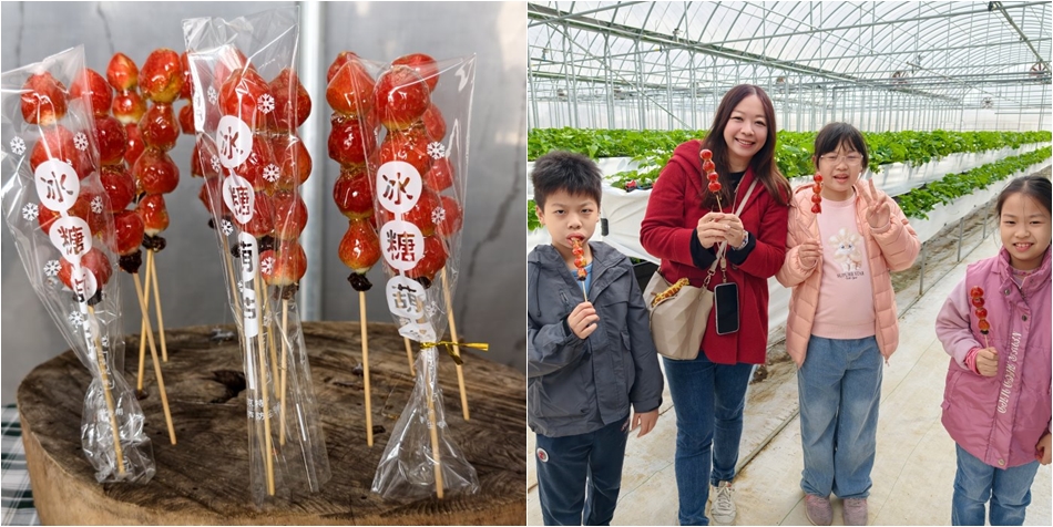 ▼採完草莓看到冰糖葫蘆忍不住買了幾根來吃,都是採用這裡的新鮮草莓製成,吃起來外脆內嫩、甜滋滋的好美味,小朋友都吃到心花朵朵開!
