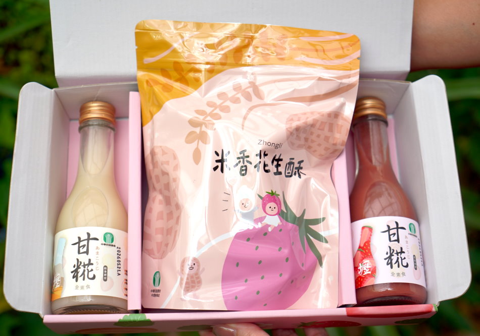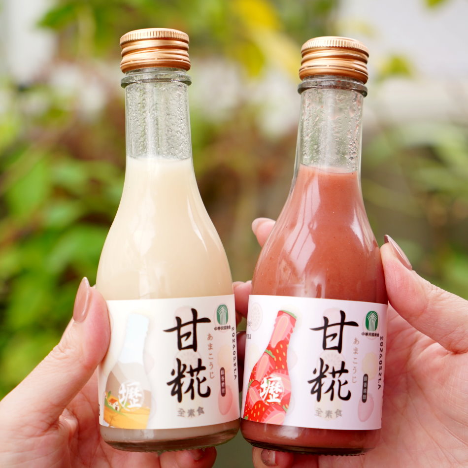 ▼內含草莓花生酥、草莓甘糀與原味甘糀,「糀」音同花,甘糀是日本傳統飲料,不含酒精也沒有添加砂糖,以米與米麴自然發酵,營養素高達300種以上,有「喝的點滴」或「美容液」之美稱,喝起來口感細緻、甘甜順口,原味跟草莓都好喝,大人小孩都適合。