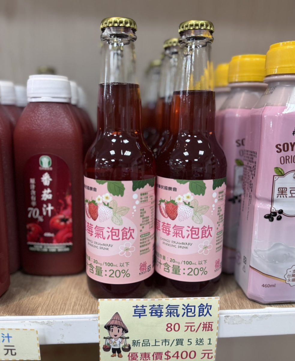 ▼中華民國農會中壢辦事處農村社區小舖也很適合排入行程,農村社區小舖裡各種草莓周邊商品通通有,今年冬季推出的新品「愛壢草莓氣泡飲」更是超夢幻,現場還有「6瓶400元(買5送1)」的優惠,不管是自己喝或是送禮都很實用。