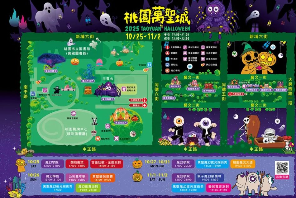 2025桃園萬聖城活動區集中在桃園藝文廣場及綠園道,但內部設計規劃了多達12座主題裝置,形成豐富的魔徑與魔域,讓您的探險之旅充滿驚喜!