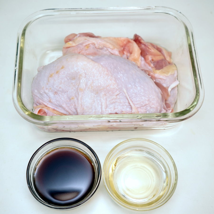 1.將雞腿肉放入容器中,用叉子在雞肉上插孔,再倒入鰹魚醬油、味醂,用手抓醃均勻,醃漬30分鐘左右。