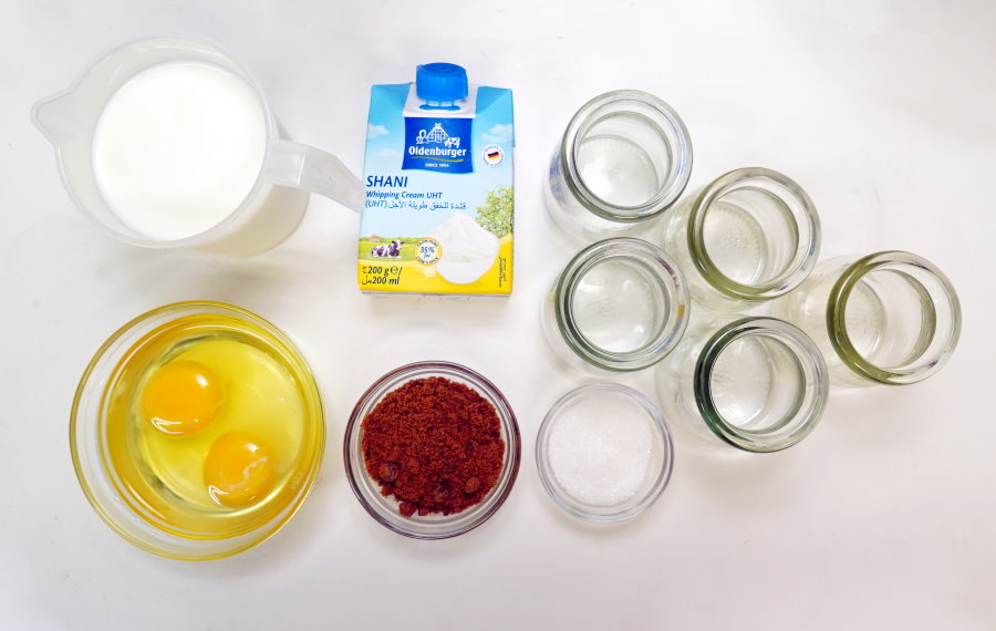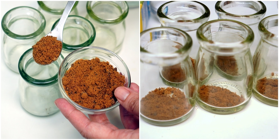 ▼首先將黑糖鋪在布丁杯底部,一方面可以取代煮焦糖的步驟(煮焦糖新手容易失敗),二方面也可以減少一些蛋腥味。