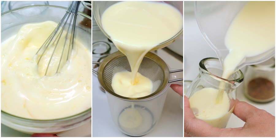 3.將攪拌均勻的布丁液過濾(將不要的蛋筋濾除,否則布丁蒸好會稍微醜醜的),再沿著杯緣緩慢倒入布丁杯中。